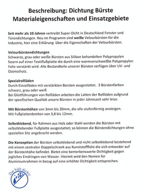 Weiße klebende Bürstendichtungen mit weichen Velour als Aufsatzmaterial streifen und verhindern das Eindringen von Staub und Schmutzbartikeln. Sie dichten dabei gleichzeitig ab, an Luftspalten die unterschiedliche zulaufen.
