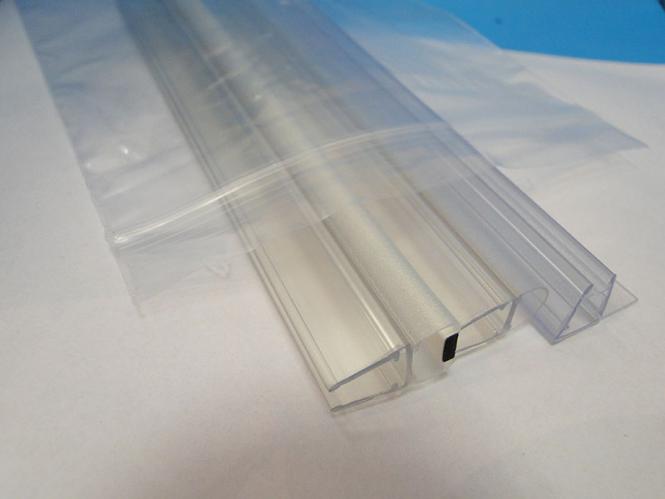 In einigen Duschtüren befinden sich Harttransparentdichtungen, die an den Glastüren aufgesteckt sind und mit einen seitlichen Anschlag auf das gegenüberliegende Duschelement dichten. Diese Duschdichtungen sind glasklar und hochtransparent.