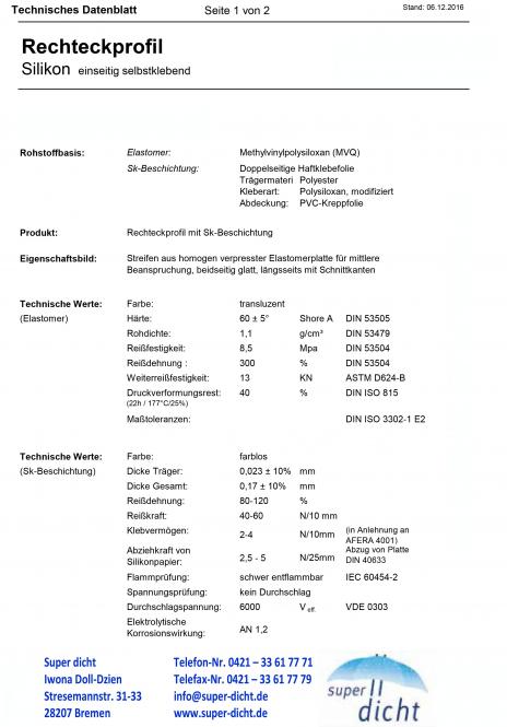 Material:homogenes extrudiertes Weichsilikon, Farbe transluzent, Shorehärte 60° +/-5 ShoreA, als Montagshilfe einseitig selbstklebend ausgerüstet