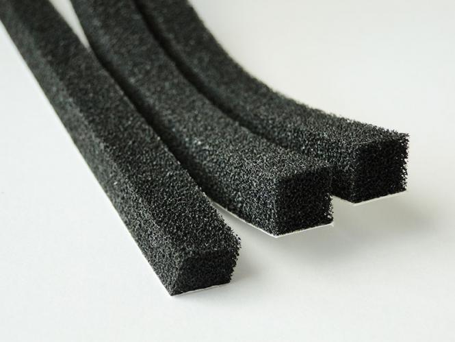 Polyurethanester, offenzelliger Weichschaum ohne Außenhaut, Imprägniert mit Acryldispersion und vorkomprimiert, Streifen aus Platte geschnitten und einseitig selbstklebend ausgerüstet, dauerelastisch, verformbar, kompressibel, sehr gutes zeitversetztes Rückstellvermögen, je nach Kompressionsgrad unterschiedliche Dichtwirkung
